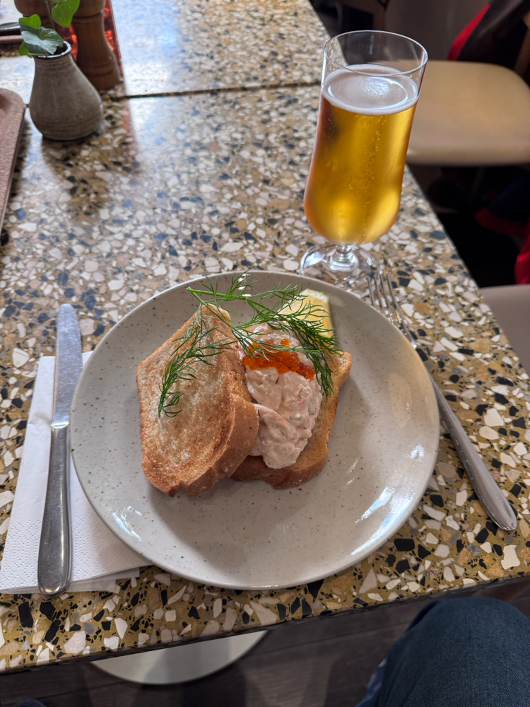 Ohne das grosse Geschäft zu reissen, gelangen wir zur Bushaltestelle, von wo wir mit dem Bus und danach mit der Bahn in die Innenstadt zurückkehren. Zufällig meldet sich der Hunger und zufällig finden wir auch ein Restaurant. Ergreifen sie die günstige Gelegenheit würde Caroline (die vom Klibby) sagen. Machen wir doch, und ich versuche mich darum an einem Toast Skagen.